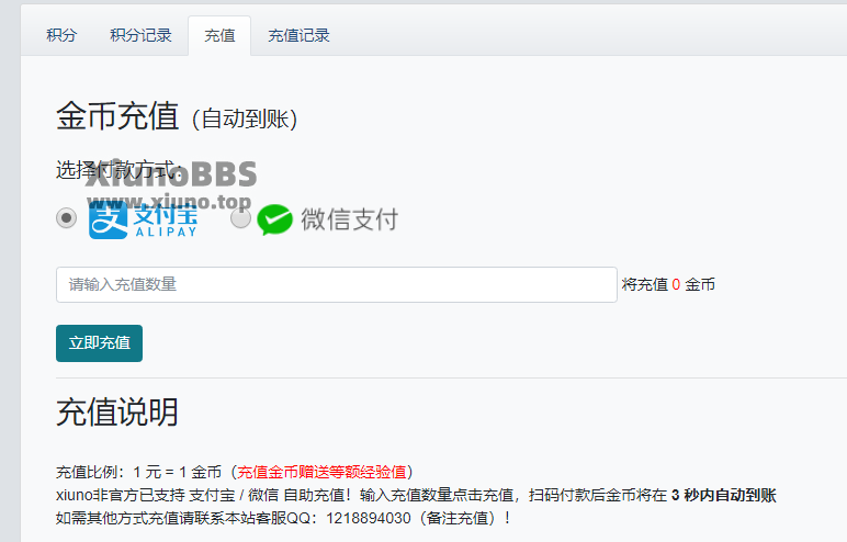 xiuno Top网已全面支持支付宝+微信自动积分充值其他
