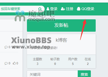 XiunoBBS默认首页只有一个登录按钮,那么我们可以添加一个QQ登录快速链接,如下图;